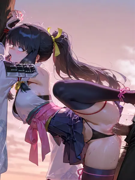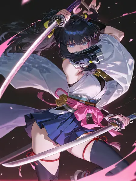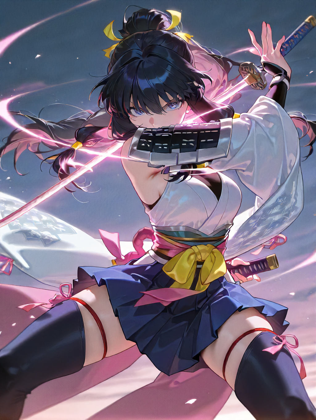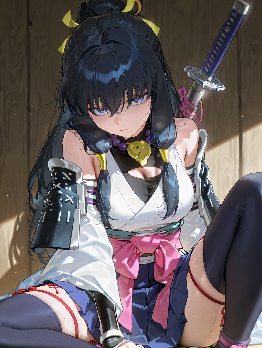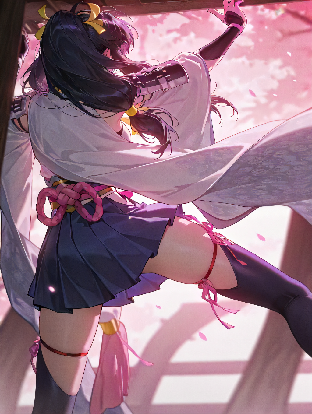 shigure(yasha), black hair, dark blue eyes, ponytail, japanese clothes, white haori, blue skirt, mini skirt, dark blue thighhighs, clothes cutout, yellow ribbon on hair, pink ornament, red rope on legs,