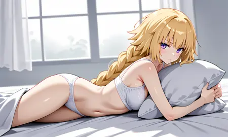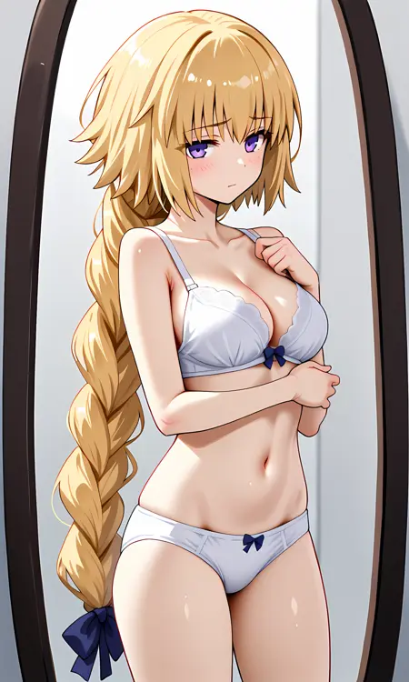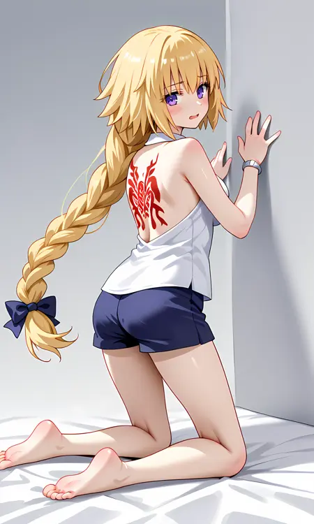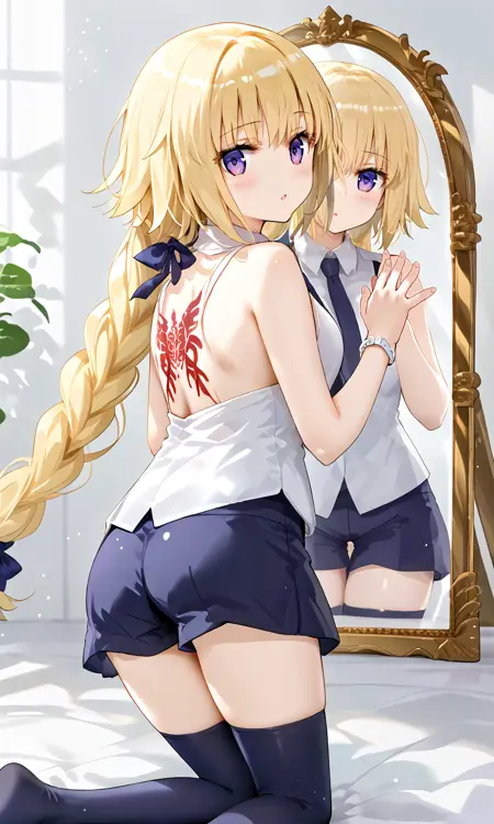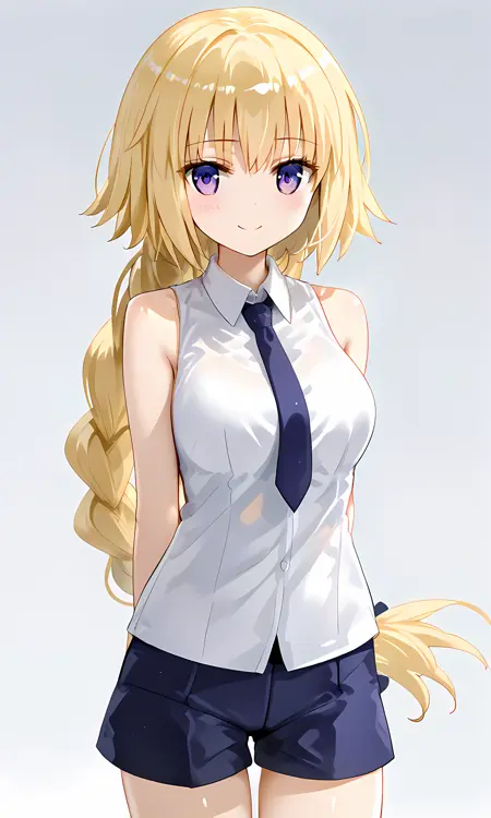 JeanneD, 보라색 눈, 금발, 긴 머리辫, 긴 머리辫에 달린 짙은 파란색 머리 리본, 흰색 민소매 상의, 짙은 파란색 넥타이, 은색 시계, 손은 벗은 상태, 짙은 파란색 반바지, 무릎 위까지 오는 짙은 파란색 양말, 검은 가죽 신발,