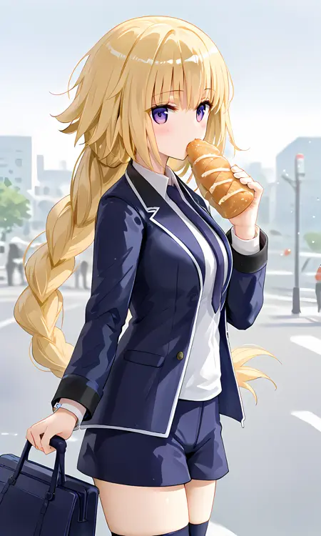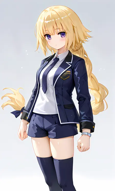 JeanneD, 보라색 눈, 금발, 긴 머리辫, 긴 머리辫에 달린 짙은 파란색 머리 리본, 흰색 테두리가 있는 짙은 파란색 블레이저, 긴 소매, 짙은 파란색 소매단, 금색 단추, 흰색 민소매 상의, 짙은 파란색 넥타이, 은색 시계, 손은 벗은 상태, 짙은 파란색 반바지, 무릎 위까지 오는 짙은 파란색 양말, 검은 가죽 신발,