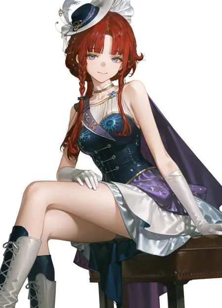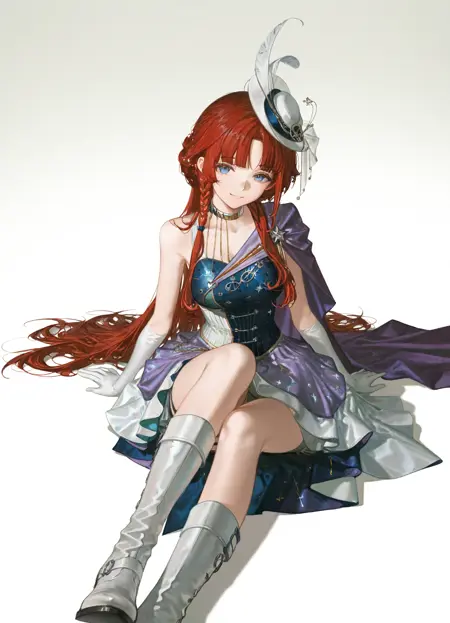 Barcarola3, 1girl, solo, red hair, long hair, wavy bangs, asymmetrical sidelocks, braided sidelock, hair over shoulder, blue eyes, mole, mole under eye, band uniform, white dress, short dress, layered dress, multicolored dress, print dress, blue dress, sleeveless dress, purple cape, shako cap, white hat, hat feather, bare shoulders, elbow gloves, grey gloves, white boots, knee boots, musical note, musical note print, treble clef