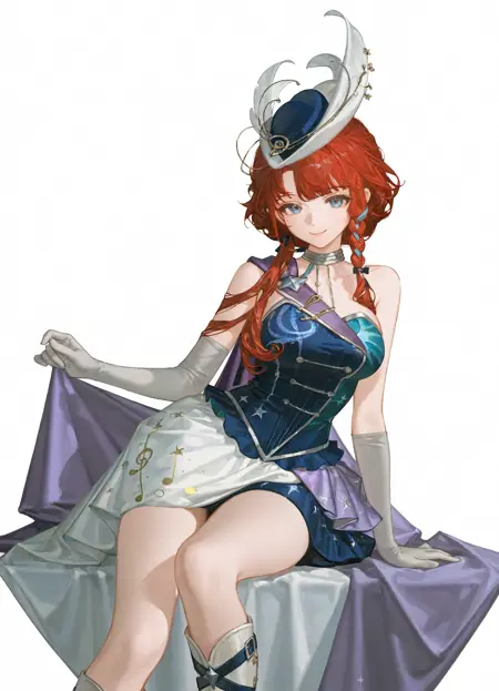 Barcarola2, 1girl, solo, red hair, very long hair, wavy bangs, long hair, braid, blue eyes, mole, mole under eye, strapless shirt, blue shirt, white dress, blue dress, white skirt, cape, black hat, hat feather, white headwear, bare shoulders, bare arms, elbow gloves, gray gloves, eighth note, musical note, star,