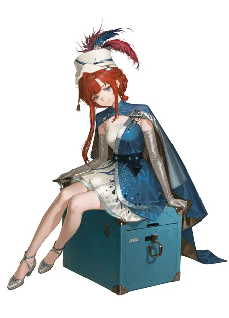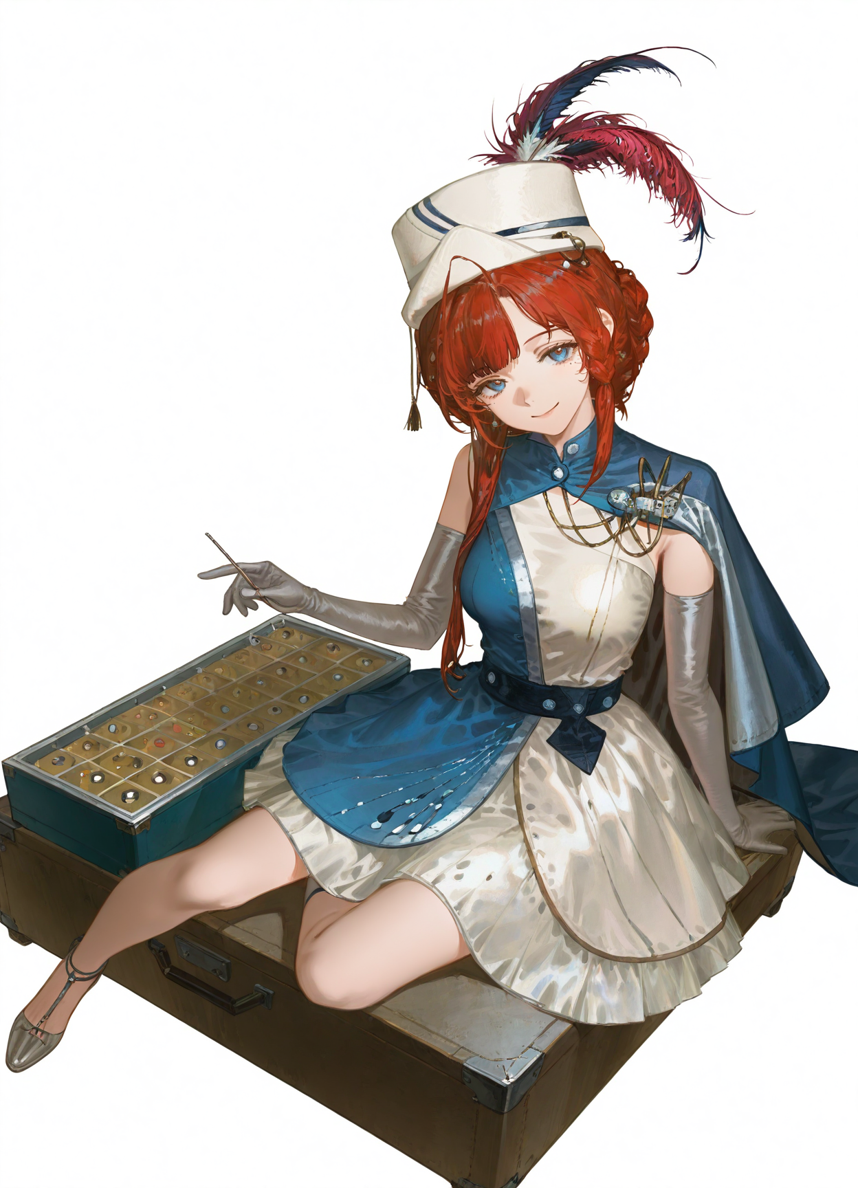 Barcarola2, 1girl, solo, red hair, very long hair, wavy bangs, long hair, braid, blue eyes, mole, mole under eye, strapless shirt, blue shirt, white dress, blue dress, white skirt, cape, black hat, hat feather, white headwear, bare shoulders, bare arms, elbow gloves, gray gloves, eighth note, musical note, star,