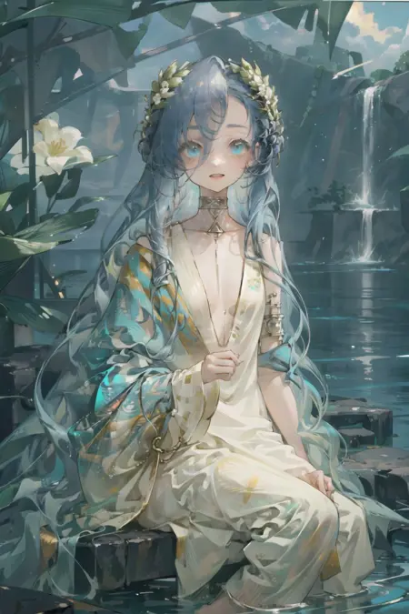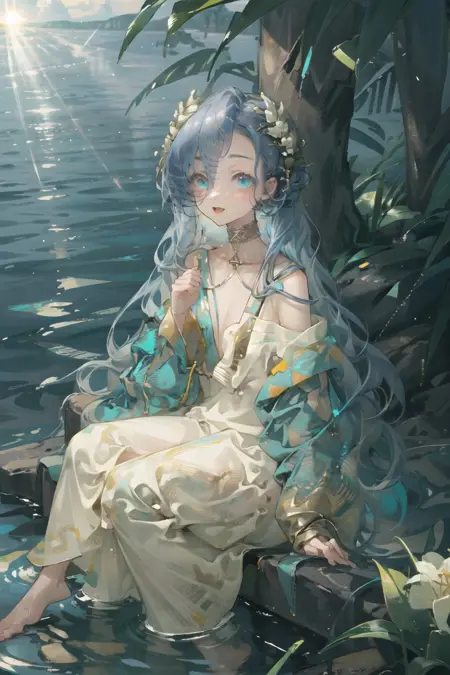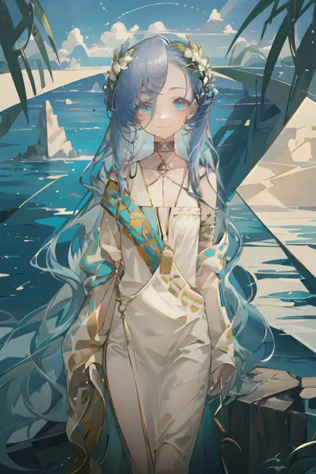 洞二服饰提示词:(Number37Insight),long hair,dress,blue hair,smile,very long hair,blue eyes,hair ornament,white dress,jewelry,wavy hair,hair between eyes,bangs,long sleeves,braid,choker,armlet,laurel crown,laurels,bare shoulders,off shoulder,barefoot,sleeves past fingers
