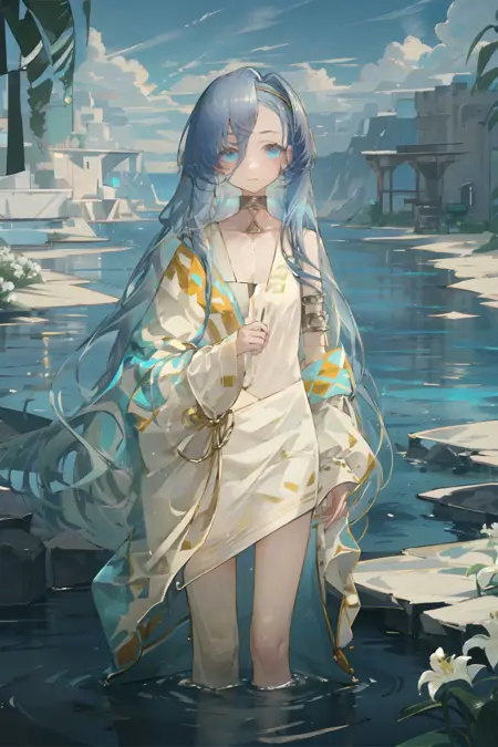 初始服饰提示词:Number37,long hair,blue hair,blue eyes,dress,very long hair,long sleeves,white dress,hairband,collarbone,bangs,hair between eyes,choker,wavy hair,