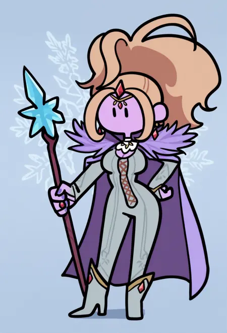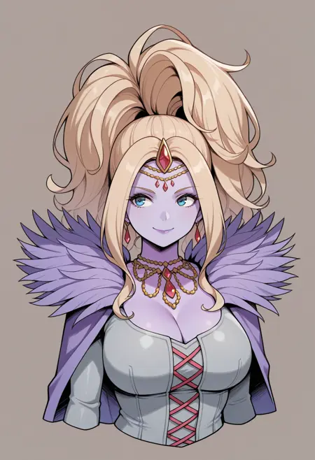 Default appearance: blonde hair, high ponytail, big hair, sidelocks, circlet, forehead jewel, blue eyes, purple skin, purple lips, earrings, necklace, white collar, grey bodysuit, cleavage cutout, feather trim, purple cape, bridal gauntlets, long sleeves, purple nails, cross-laced clothes, high heel boots, ankle boots, grey footwear