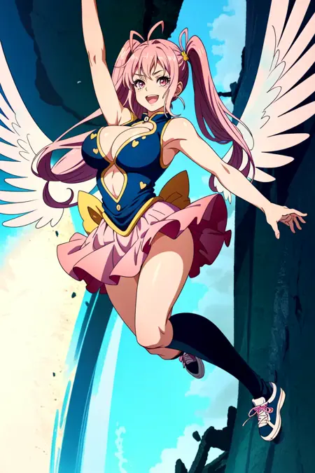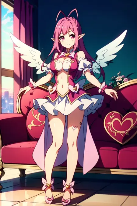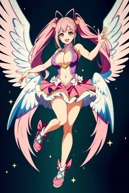 梅塔塔,1girl,獨奏,長髮,粉紅色的頭髮,乳房,天線頭髮,微笑,蝴蝶結,張開嘴,粉紅色的眼睛,心,肚臍,手臂向上,大乳房,連衣裙,服裝剪裁,裙子,很長的頭髮,翅膀、鞋子、看著觀眾、乳溝、裸露雙腿、:d、低長髮