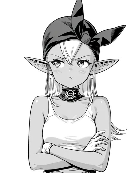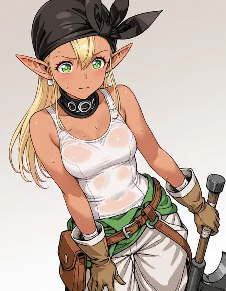 训练提示词:c4rri3, 长发, 尖耳朵, 深色皮肤女性, 精灵, 头巾, 颈巾, 耳环, 无袖背心, 宽松长裤, 手套,