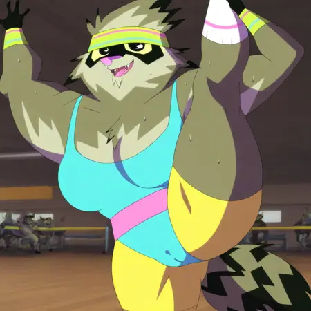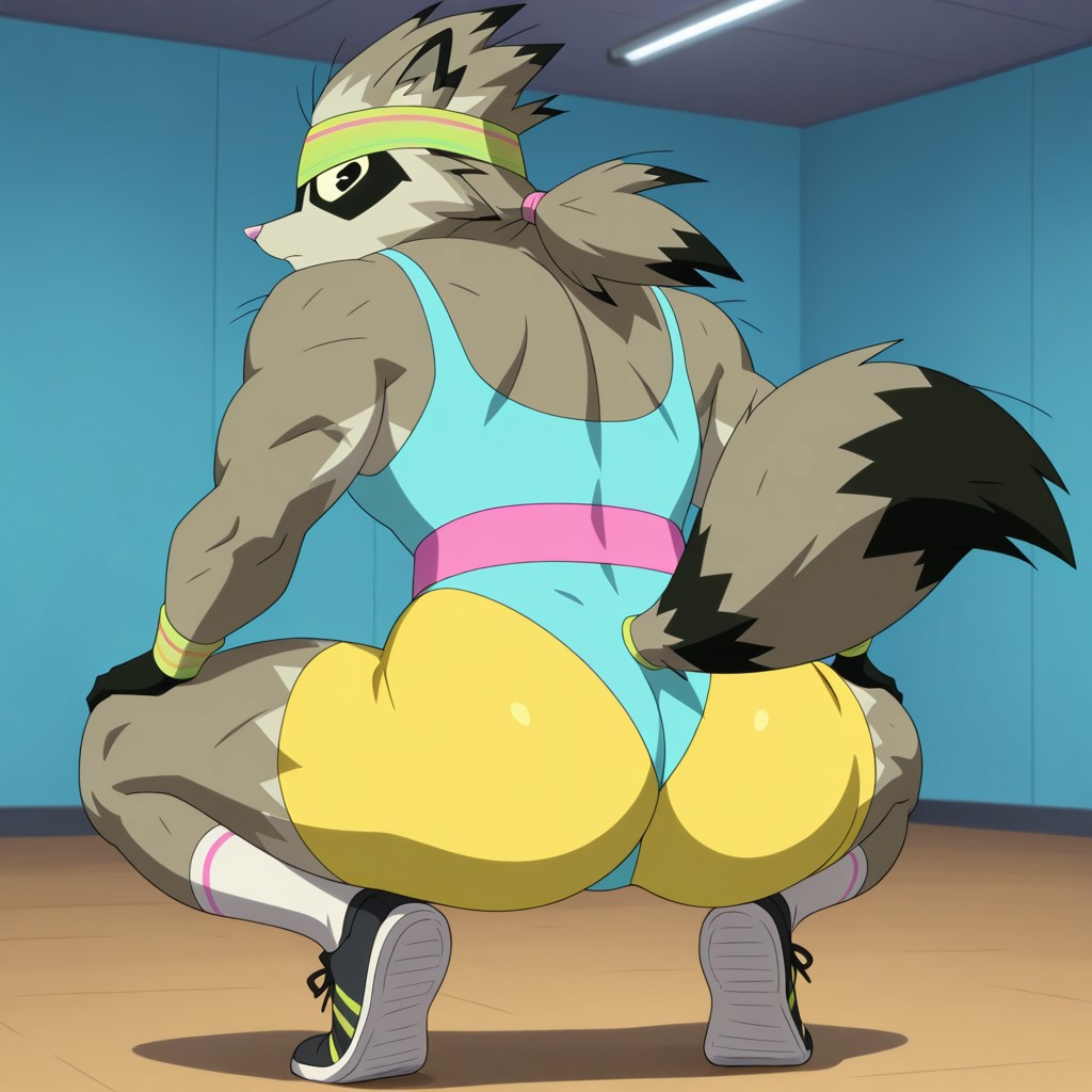 muscular female, raccoon, raccoon girl, grey and black fur, black eyes, yellow sclera, pink nose, black hands, raccoon tail, flat chested, muscular figure,