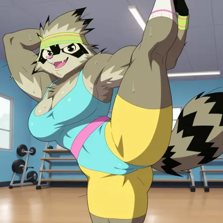 flat chested, muscular figure, aerobics outfit, yellow shorts, blue leotard, sweatband, white socks, black shoes,