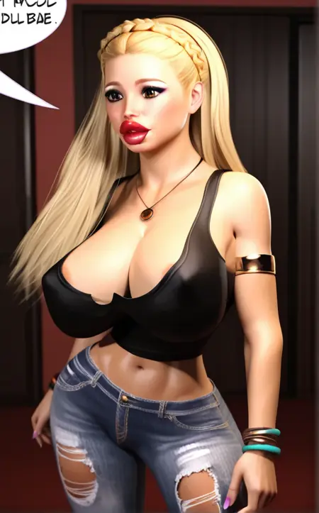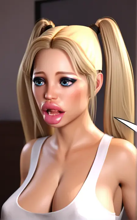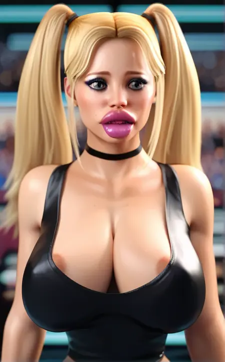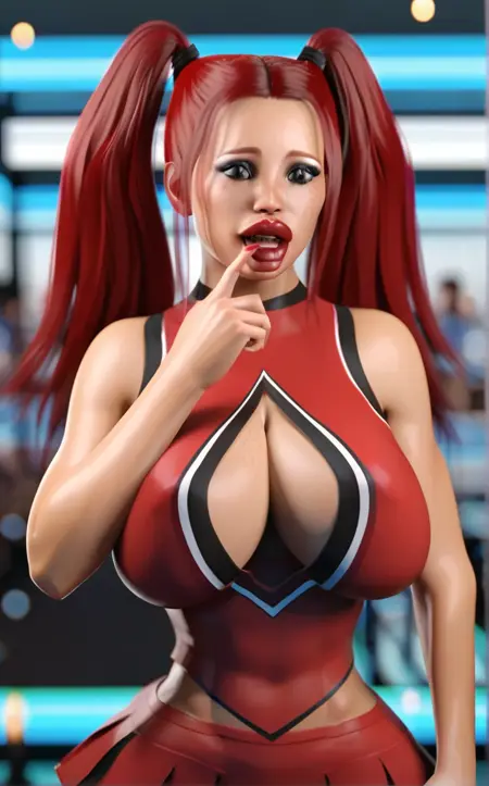 Bimbo_STYLE_Abimboleb_ownwaifu, 1girl, blurry background, blurry foreground, large breasts, cleavage cutout, depth of field, red hair, long hair, open mouth, twintails, clothing cutout, finger to mouth, finger in own mouth, upper body, red lips, makeup, freckles, realistic, cheerleader, bare shoulders, teeth, sleeveless, lipstick, nose, hand up, black eyes, thick lips, bimbo