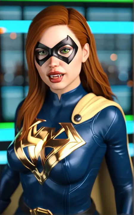 Main_STYLE_Abimboleb_ownwaifu, 1girl, blurry background, blurry foreground, bodysuit, medium breasts, depth of field, domino mask, lips, motion blur, superhero, looking at viewer, brown hair, belt, yellow cape, arrow (projectile), animification, long hair, fangs, realistic, western comics (style), gloves, animal ears, green eyes, genderswap (mtf)