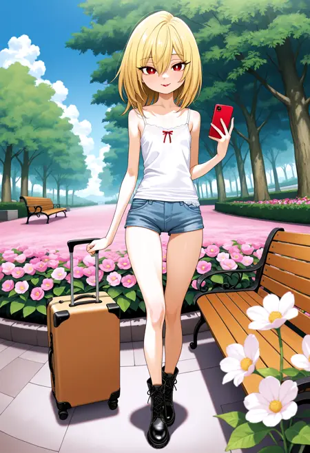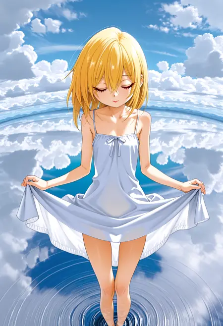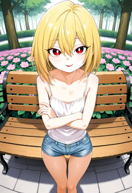 HimekawaIbara, blonde hair, hair between eyes, long eyelashes, white pupils, petite, red lips, skinny, narrow waist, slim legs, thigh gap,