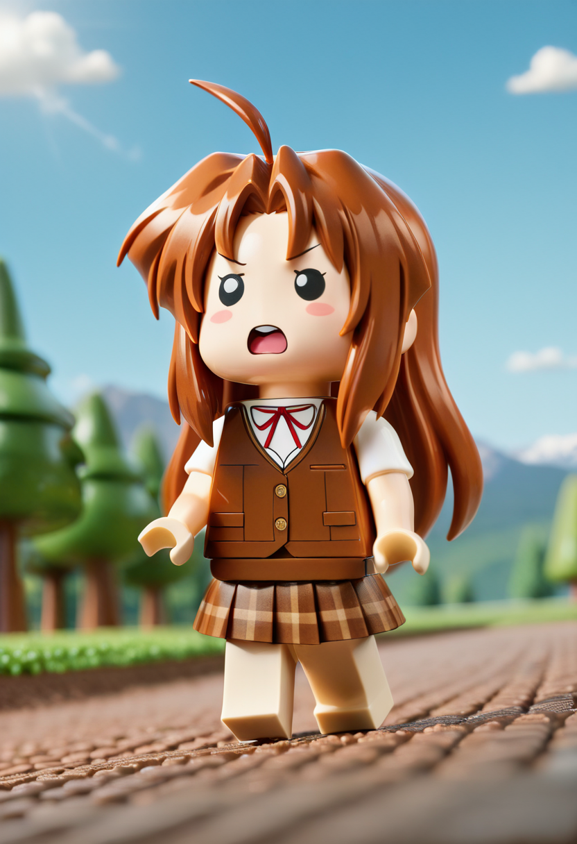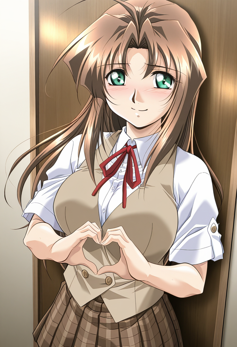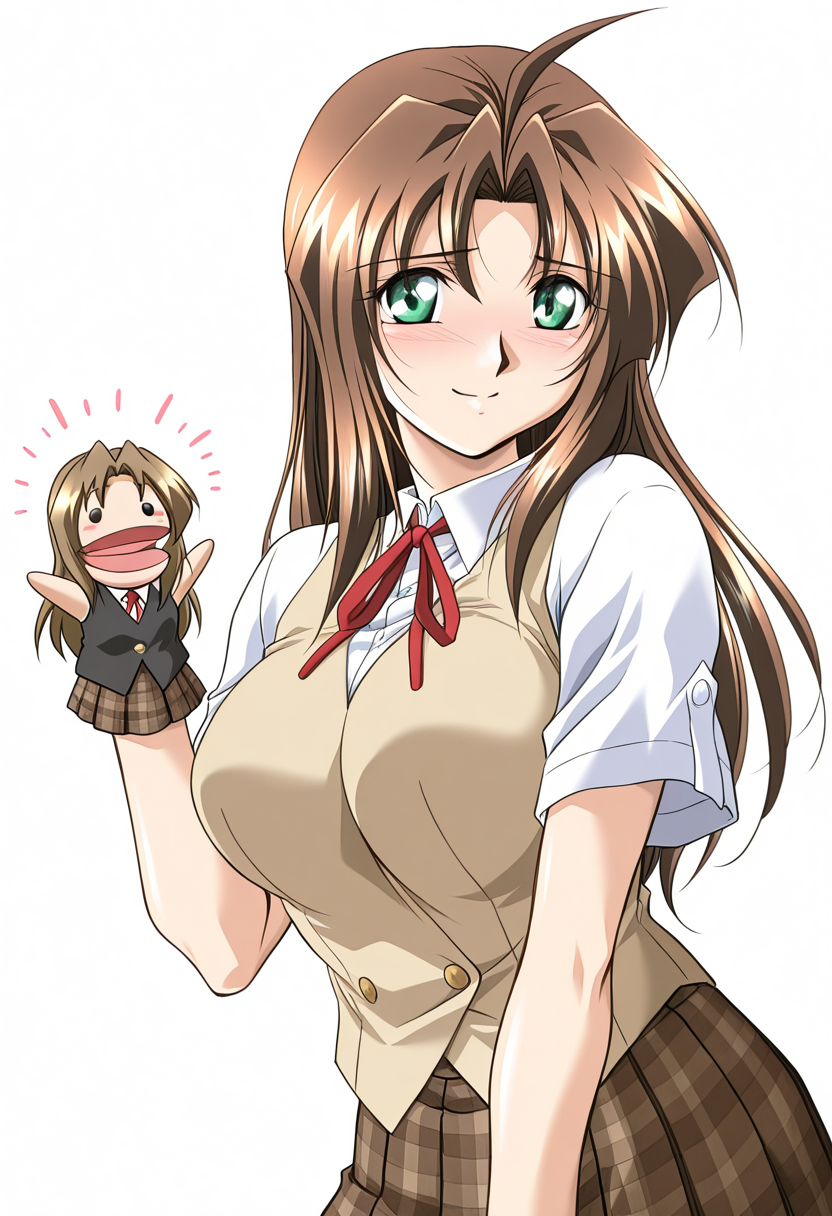 衣装: 学校制服, ベスト, 赤いリボン, チェックスカート, 茶色のスカート, プリーツスカート, 短袖