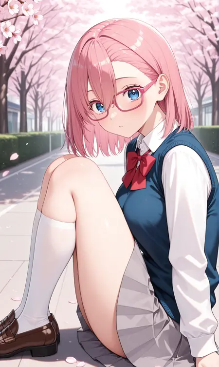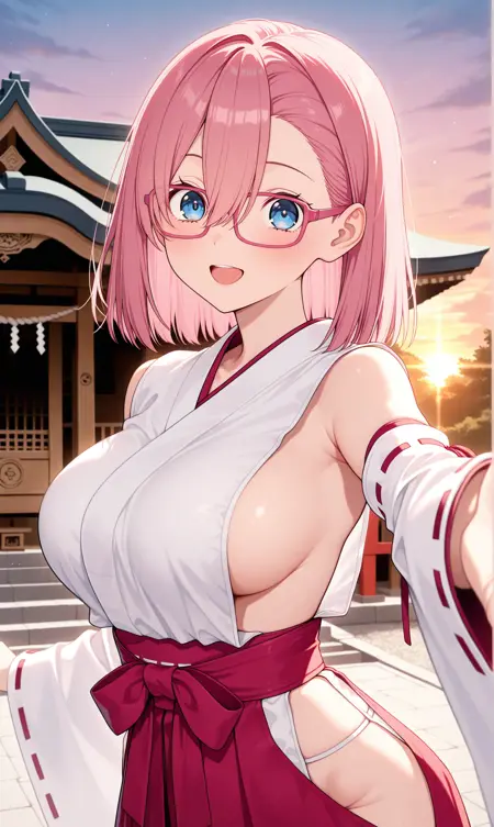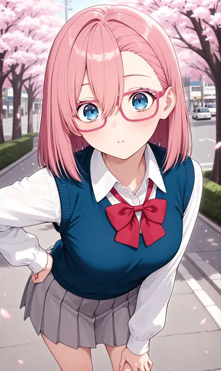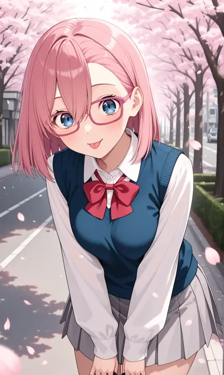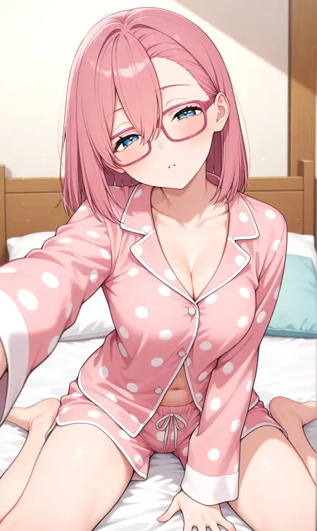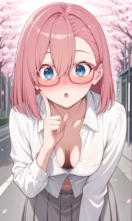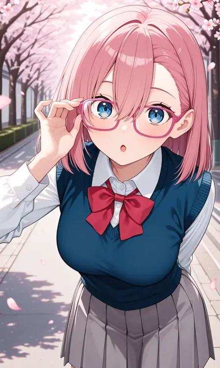 amano ririsa, 분홍색 머리, 중간 길이 머리, 파란 눈, 눈 사이의 머리, 분홍 프레임 안경