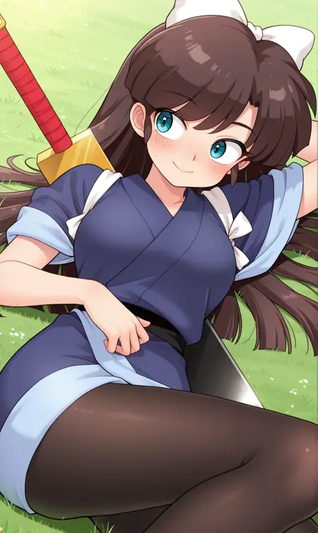 파란 키모노, 일본 복장, 팬티스타킹, 과대한 물체, 무기, 등에 무기, 거대한 무기