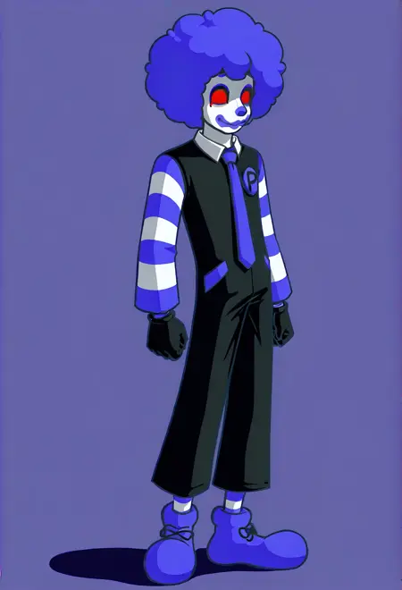 PClo0wnFNFMM, 1boy, pale white skin, clown, red hollow eyes, purple lips, purple nose, purple hair, black clown uniform, white collar, white-purple striped sleeves, black gloves, purple necktie, purple shoes,