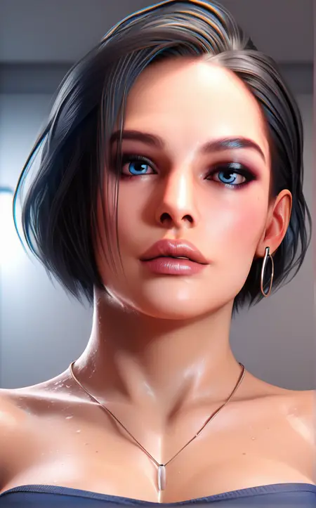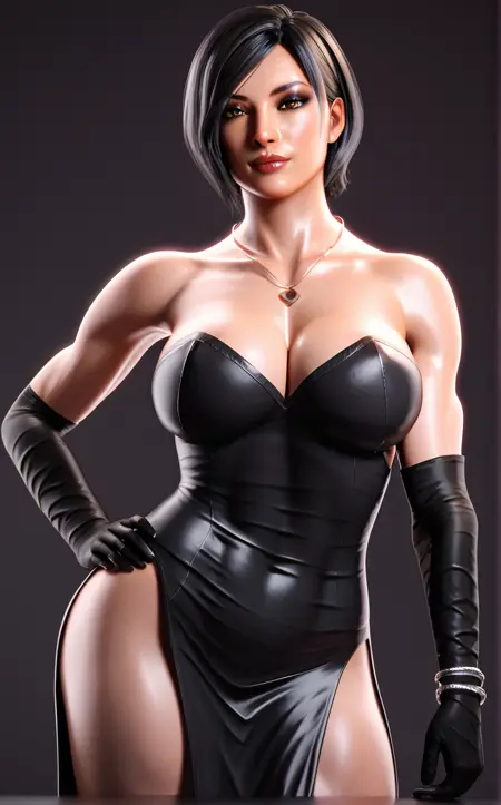 PONYXL_STYLE_NeroHunter_ownwaifu, 1girl, bare shoulders, black gloves, black hair, large breasts, cleavage, black dress, elbow gloves, lips, short hair, looking at viewer, brown eyes, jewelry, necklace, hand on hip, strapless dress, realistic, snake, collarbone, bracelet, hand on own hip, side slit