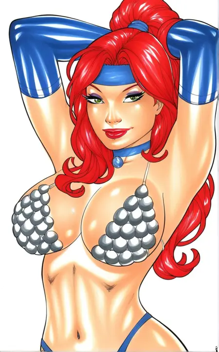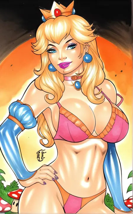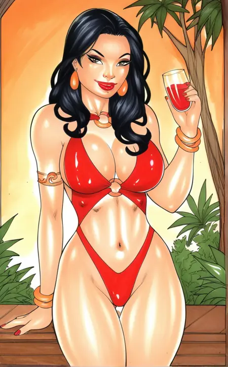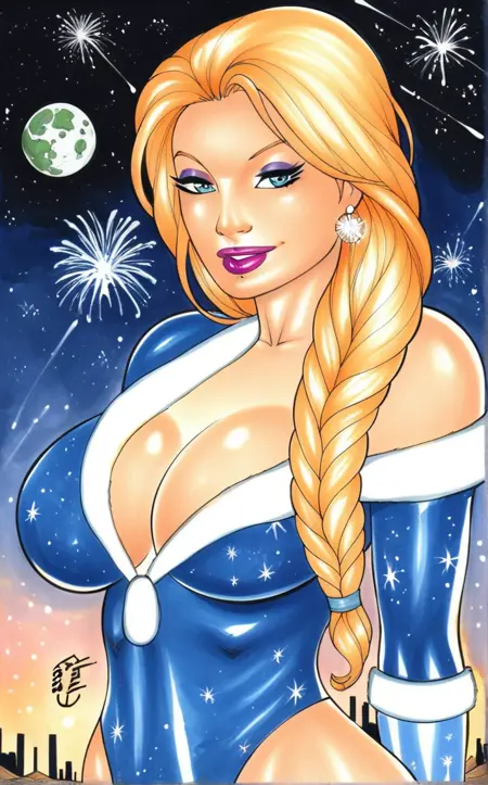 PONYXL_STYLE_Elberty_ownwaifu, 1girl, black hair, blue eyes, large breasts, lips, lipstick, long hair, makeup, marker (medium), moon, nail polish, navel, red nails, traditional media, looking at viewer, cleavage, jewelry, bikini armor, pelvic curtain, purple nails, loincloth, earrings, midriff, planet, bracelet, crown, armlet