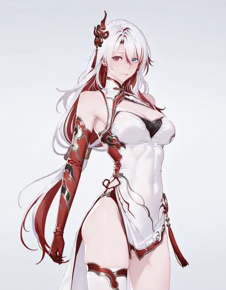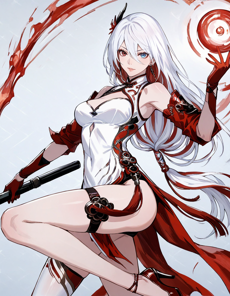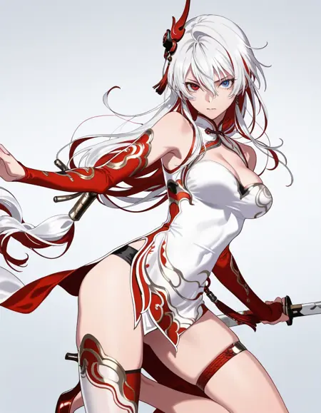 mai_pgr_lucia_shqy_jlys,mature female,(aged up:2),red_eyes,heterochromia,blue_eyes,hair_between_eyes,low-tied_long_hair,white_hair,multicolored_hair,red_hair,hair_ornament,breasts,china_dress,red_gloves,bare_shoulders,white_thighhighs,single_thighhigh,high_heels,red_footwear,holding_katana,sheath,sheathed,scabbard