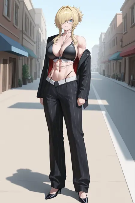 공식 대안 복장,보석,목걸이,목반지,가슴 사이,가슴 사이 목걸이,정장,줄무늬 옷,줄무늬 수트,줄무늬 패턴,복부,재킷,어깨 노출,한쪽 어깨 노출,긴 소매,열린 옷,열린 재킷,줄무늬 재킷,다색 재킷,양면 재킷,양색 재킷,검은 재킷,빨간 재킷,속옷,비키니,수영복,검은 브라,언더버스트,배 체인,복부,배꼽,팬티 스트랩,검은 바지,광대뼈,펌프,검은 신발