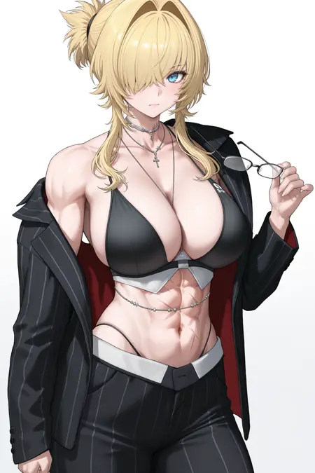 IL_Grave Beautiful You,solo,1girl,abs,근육질,무거운 여자,금발,한쪽 눈 위의 머리카락,머리카락이 눈을 가림,측면 머리카락,긴 머리카락이 달린 짧은 머리,피그테일,파란 눈,가슴선,안경,가슴,배에 흉터