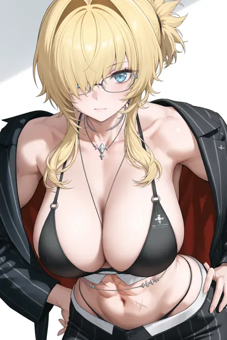 IL_Grave Beautiful You,solo,1girl,금발,긴 머리카락이 달린 짧은 머리,측면 머리카락,피그테일,한쪽 눈 위의 머리카락,파란 눈,가슴선,가슴,큰 가슴,안경,복부,근육질,무거운 여자,배에 흉터