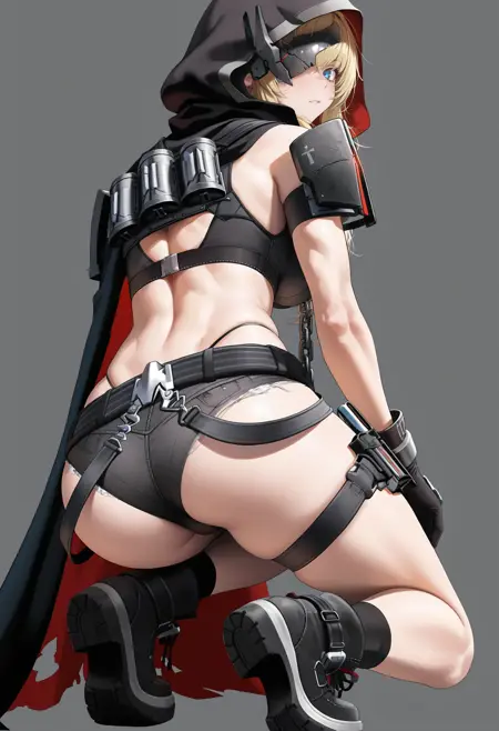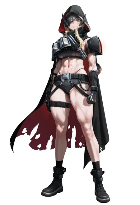 broken mask,one eye covered,hood up,hood,cape,hooded cape,two-sided fabric,black cloak,red cloak,torn cloak,crop top,black crop top,armor,shoulder armor,midriff,navel,black gloves,metal gloves,suspenders hanging,black belt,black shorts,micro shorts,suspender shorts,highleg,highleg panties,black panties,micro panties,thighs,thigh strap,black socks,black shoes,boots,black footwear