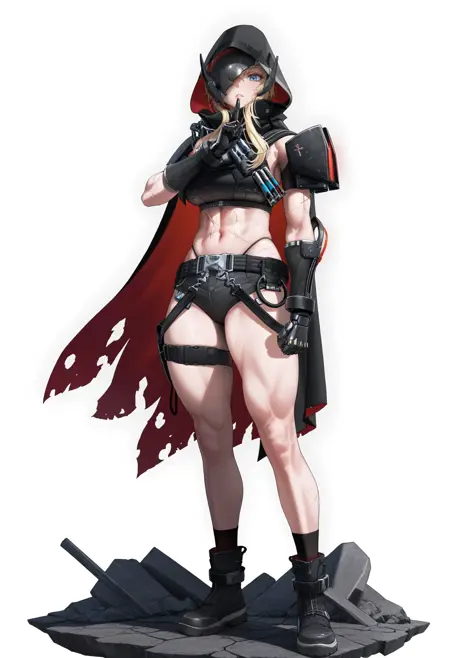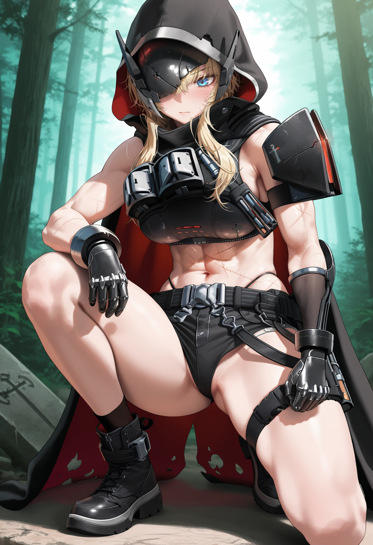 hood,hood up,gloves,black gloves,boots,black footwear,midriff,belt,cape,crop top,armor,hooded cape,one eye covered,hair over one eye,shoulder armor,muscular,highleg panties,broken mask,black crop top,cloak,black cloak,black belt,suspenders hanging,metal gloves,red cloak,two-sided fabric,highleg,black panties,micro panties,socks,black socks,torn cloak,shoes,black shoes,thigh strap