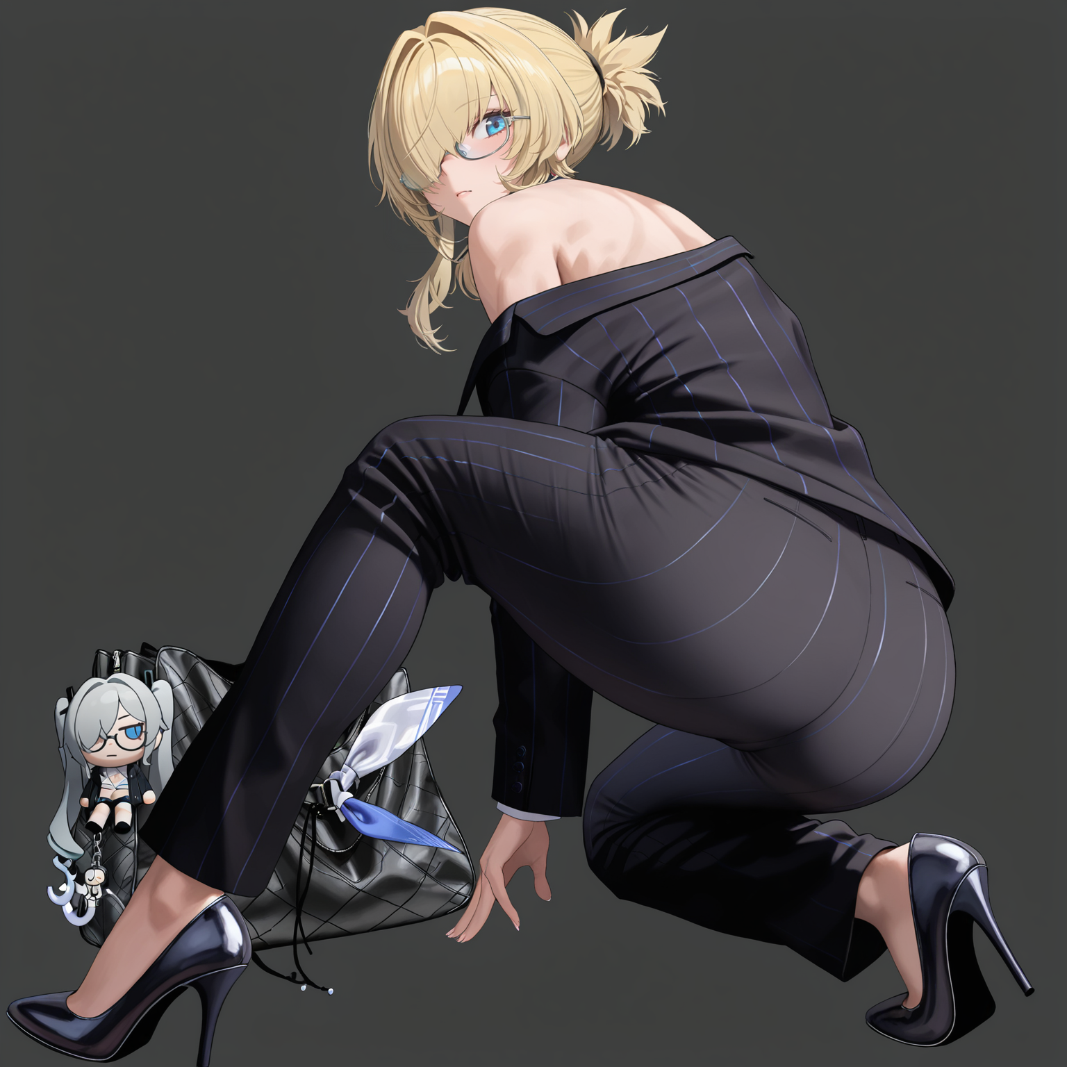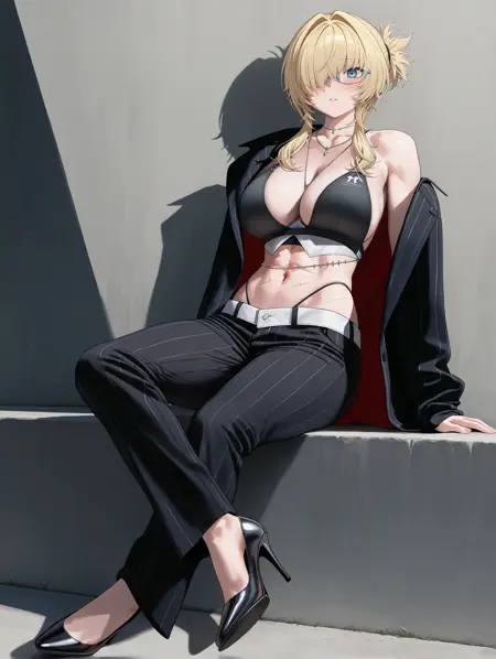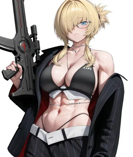 IL_Grave Beautiful You,solo,1girl,abs,toned,muscular female,blonde hair,hair over one eye,hair intakes,sidelocks,short hair with long locks,ponytail,blue eyes,cleavage,glasses,breasts,scar on stomach