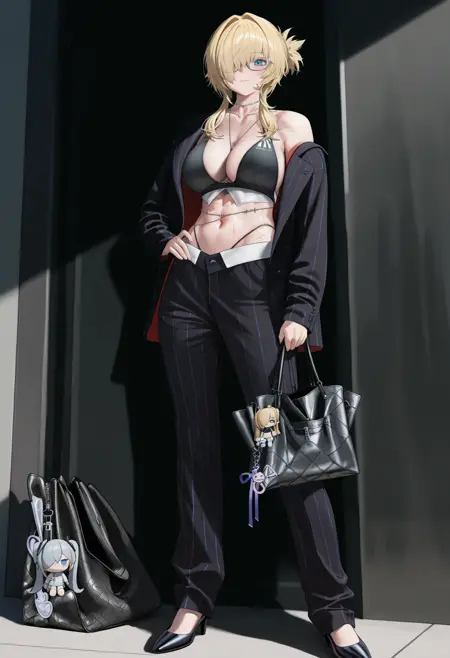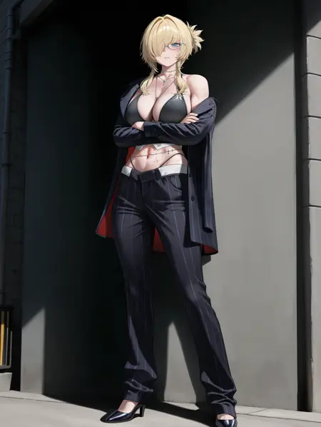 official alternate costume,jewelry,neck ring,necklace,between breasts,necklace between breasts,suit,striped clothes,pinstripe suit,pinstripe pattern,midriff,jacket,off shoulder,single bare shoulder,long sleeves,open clothes,open jacket,striped jacket,multicolored jacket,two-sided jacket,two-tone jacket,black jacket,red jacket,underwear,bikini,swimsuit,black bra,underbust,belly chain,stomach,navel,panty straps,black pants,collarbone,pumps,black shoes