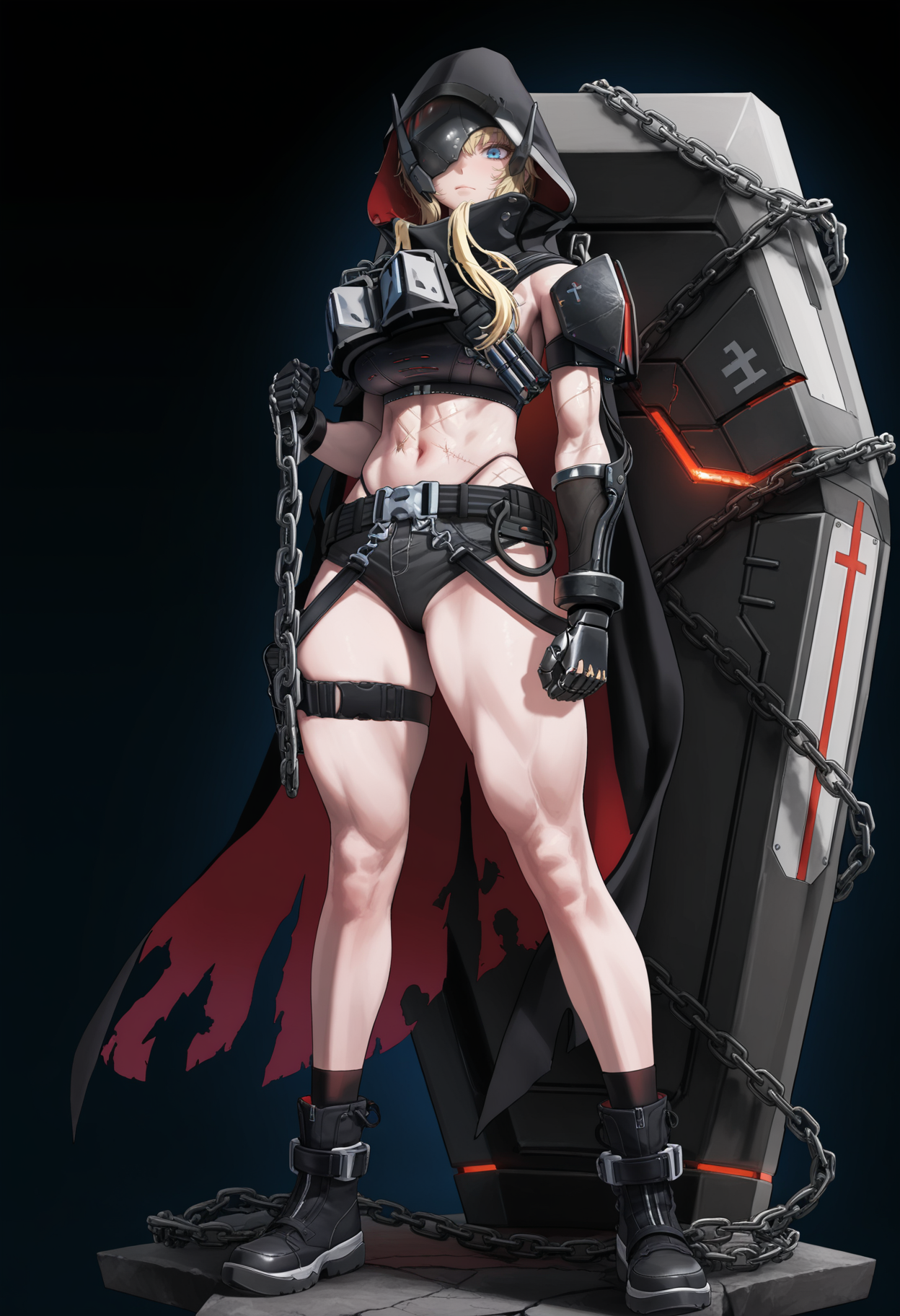 IL_Grave,solo,1girl,abs,toned,muscular female,blonde hair,sidelocks,hair over one eye,blue eyes,breasts,scar on stomach,scar on arm