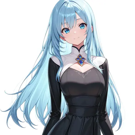 A blue-haired, blue-eyed, long-haired noble lady with a slightly busty figure.