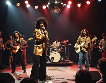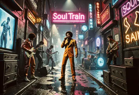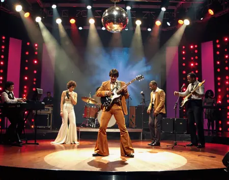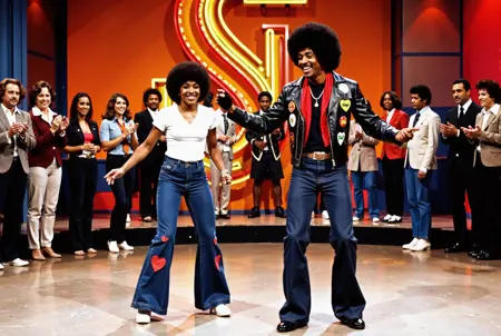 70~80년대 최고의 음악 텔레비전 쇼 장면으로 들어서세요. 디스코 공, 아프로 헤어스타일, 벨본텀 바지, 다양한 대담한 복장이 무대를 가득 채웁니다. 모두가 춤추는 이들로,狂野하고 열정적입니다. 물론, 여러분이 가장 좋아하는 펑크와 소울 가수들과 밴드들도 여기 있습니다.