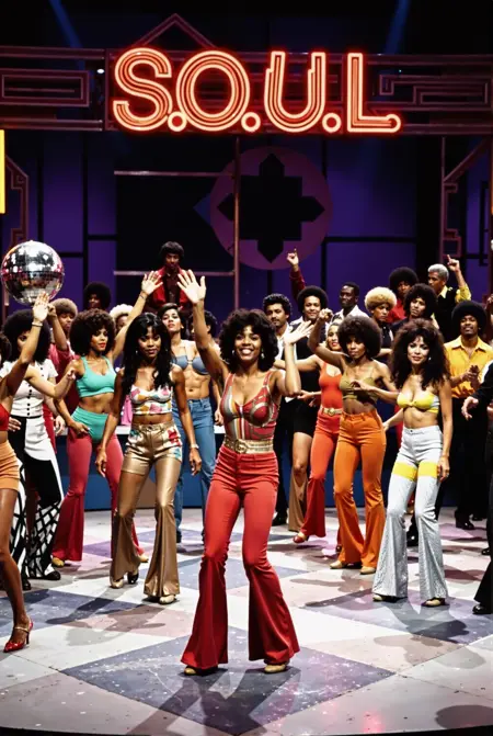 In the background's two sides, a crowded group of dancers of varying heights,predominantly African American dressed in colorful retro outfits are standing and (dancing asynchronously :1.4), lining up on both sides of the foreground 2 dancers.The backdrop features a large neon "SOUL" sign with yellow and red lights set against an orange wall. ((A clear but narrow space behind the dancing couple):1.4).