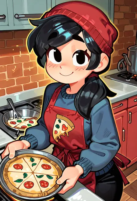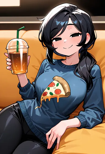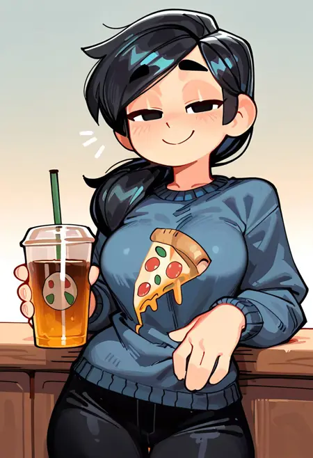 robloxpizzaash, black hair, solo, blue shirt long sleeves, sweater, long hair, ponytail, 1girl, black pants, dot eyes