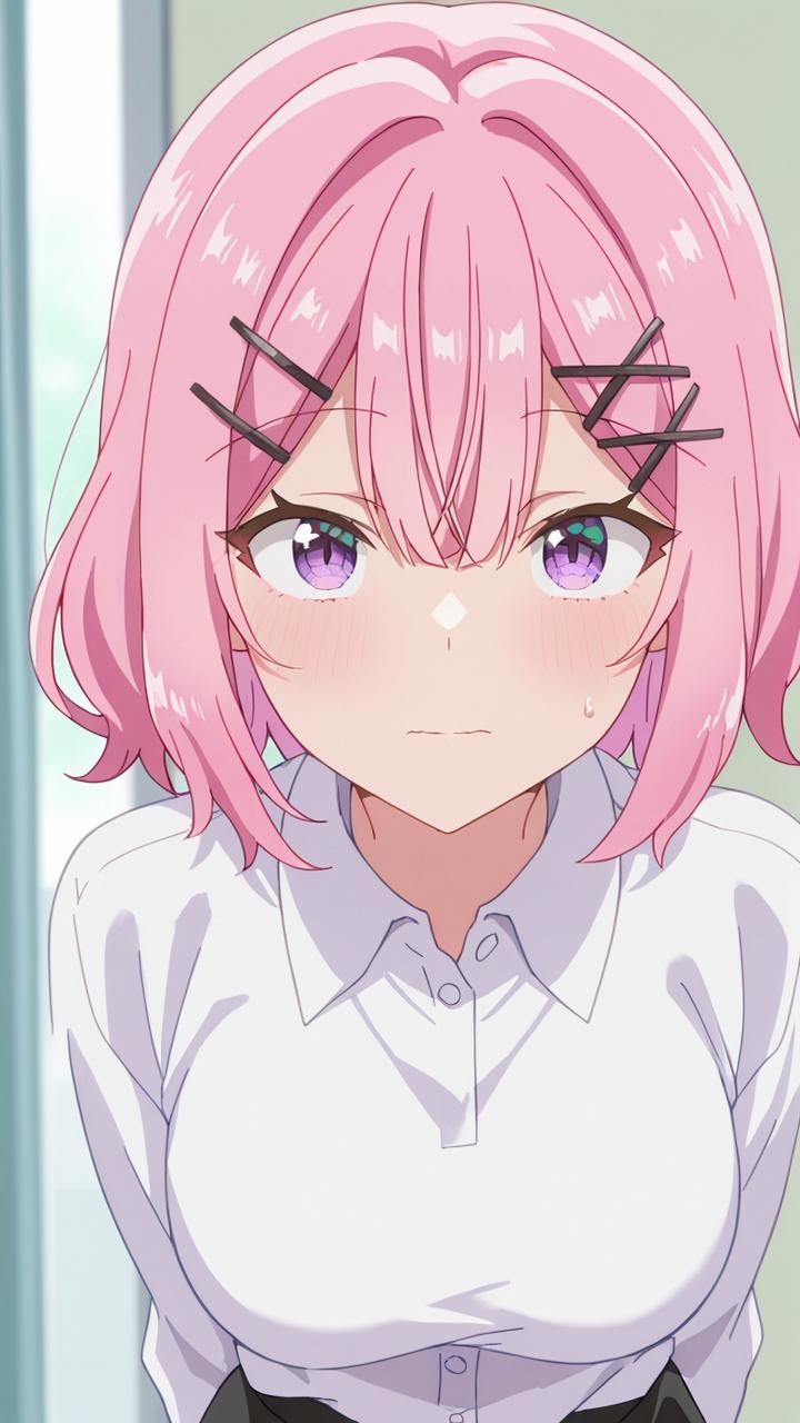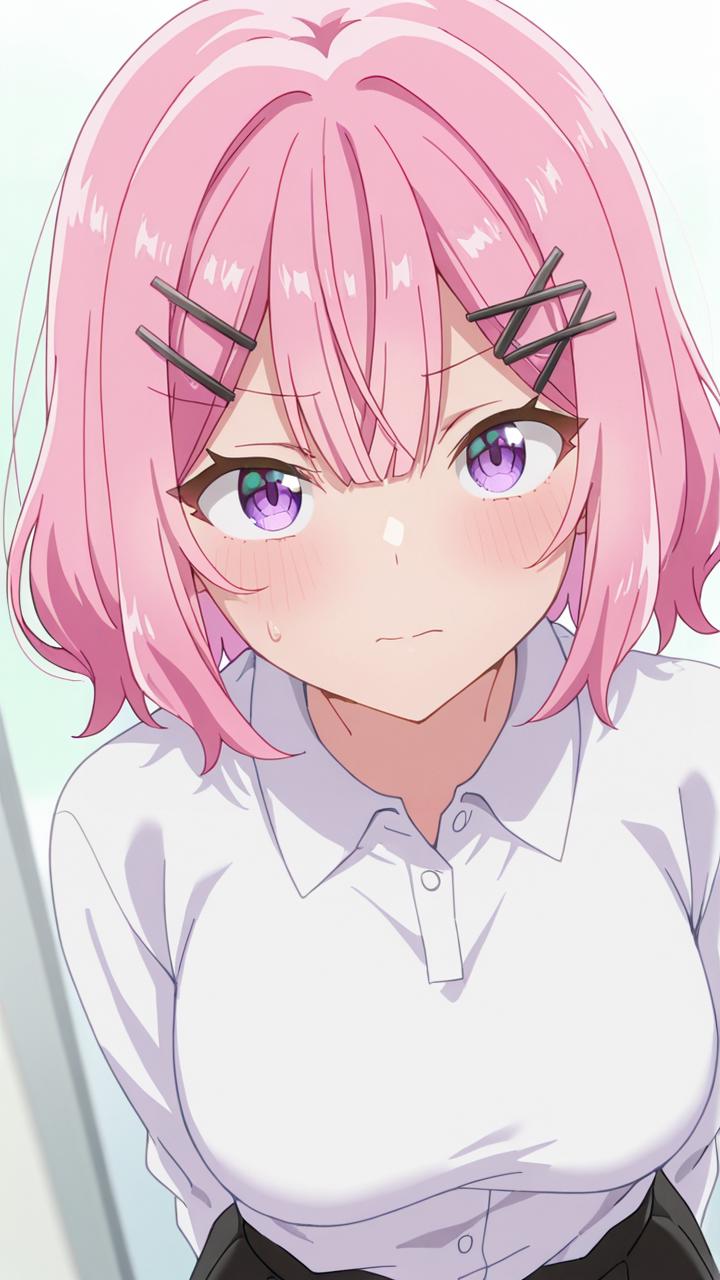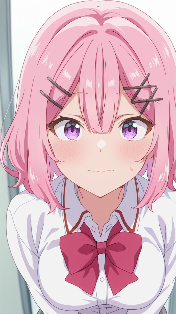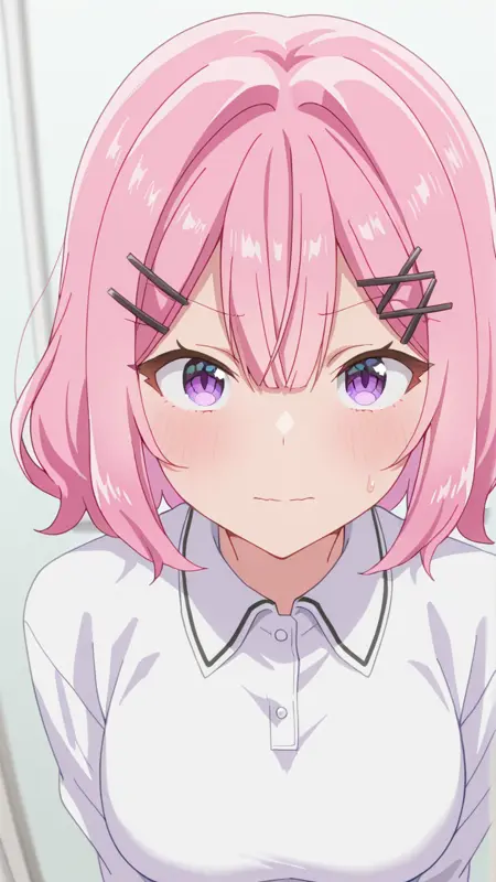 RenakoAmaori, pink hair, short hair, hair between eyes, hairclip, purple eyes, medium breasts,