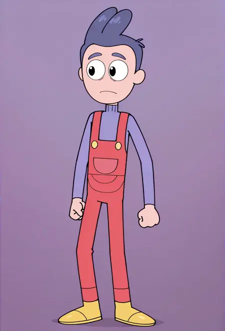 HumanJaxHSG, 1boy, light skin, cool-toned purple hair shaped upward, black eyes, long-sleeved lavender shirt, bright red overalls featuring yellow buttons, Yellow shoes,