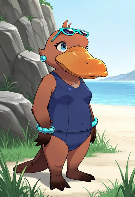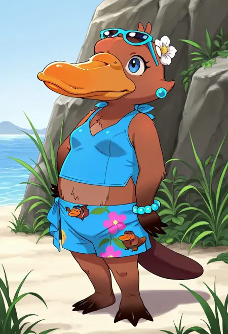 1girl, animal, female, platypus, Elle, brown fur, blue eyes, swimsuit, topwear, sunglasses, sunglasses on forehead, earrings, bracelet, beaver tail, duck feet