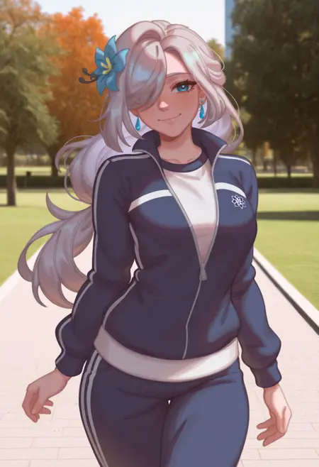 캐릭터 태그: 파란 눈, 회색 머리카락, 한쪽 눈 위의 머리카락, 긴 머리카락, 머리 꽃