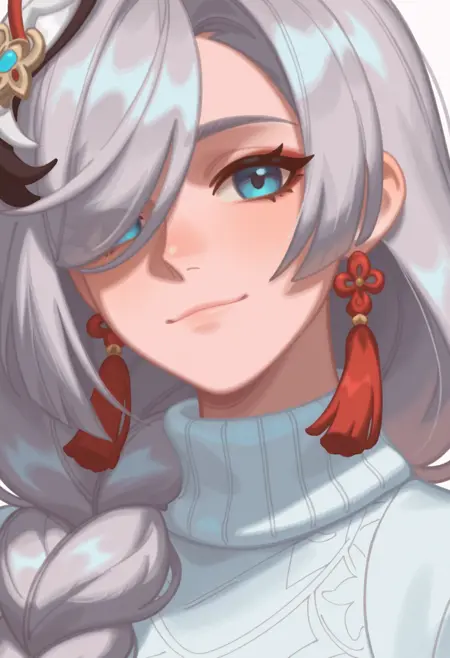 キャラクタータグ: 青い目、灰色の髪、片方の目に髪がかかる、長い髪、編み込みポニーテール、髪飾り
