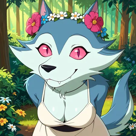canine, wolf, wolf girl, grey and white fur, black slit pupils, pink sclera, black nose, fang, wolf ears, wolf tail,