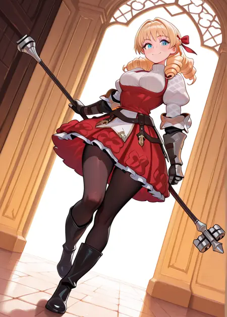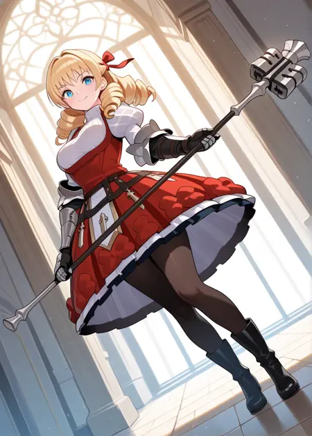 scarlettxd, 1girl, solo, blonde hair, blue eyes, drill hair, long hair, red ribbon, red bow, hair ribbon, hair bow, braid