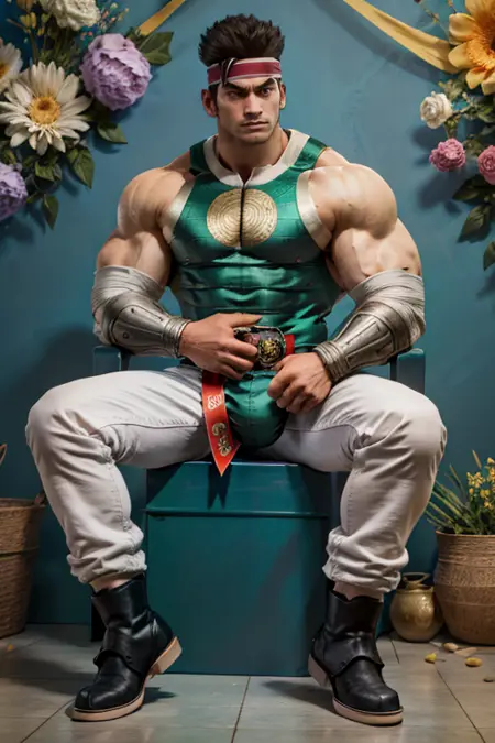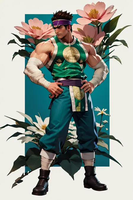 태그: Hwang_Soulcalibur_III, 솔로, 단발, 갈색 머리, 검은 머리, 1남자, 남성 중심, 바지, 근육질, 헤드밴드, 붕대, 안대, 가슴근육, 근육질 남성, 바라, 큰 가슴근육, 측면 수염, (흰색 바지), 사이드펙, 녹색 상의, 녹색 옷, 한국 복식, 부츠, 붕대 양말