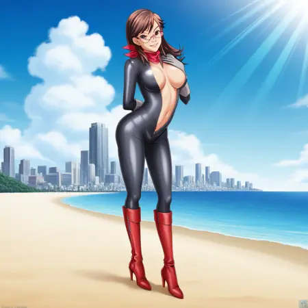 紧身衣:(Reiko Mizusaki, THE Gal Mahjong, T-GAL-M, T-GAL-M_ Reiko_Mizusaki, 眼镜, 棕色头发, 大胸, 黑色眼睛, 围巾, 紧身衣, 拉链未拉,中间开口,肚脐,手套,机车服,高跟靴,过膝靴)
