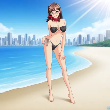 泳装(黑色):(Reiko Mizusaki, THE Gal Mahjong, T-GAL-M, T-GAL-M_ Reiko_Mizusaki, 眼镜, 棕色头发, 大胸, 黑色眼睛, 围巾, 泳装, 比基尼, 眼镜, 侧绑式比基尼下装, 黑色比基尼, 带状上衣, 下胸围, O型环, 胸部突出)