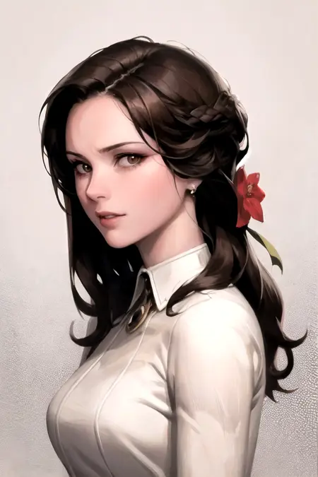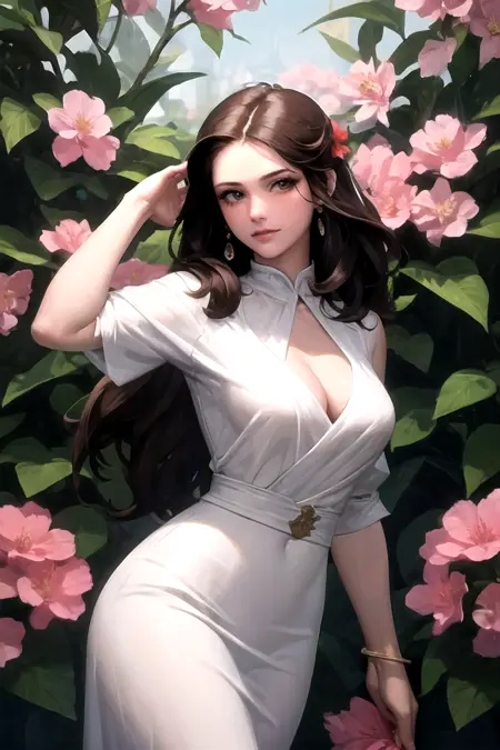 - 1girl, solo, breasts, long hair, green eyes, makeup, long hair, brown hair, lips, breasts, brown eyes, flower, jewelry, dress,