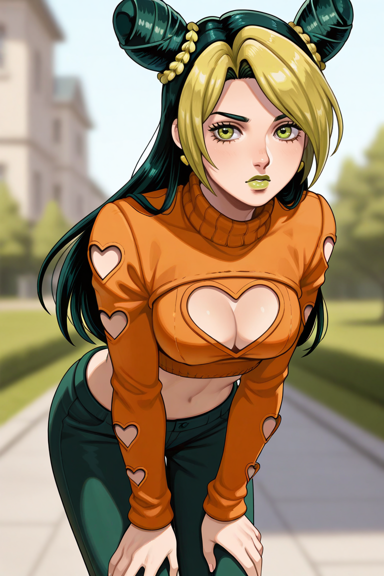 长发,双丸子头,双色头发,绿色嘴唇,心形镂空,橙色毛衣