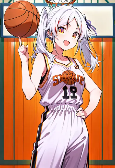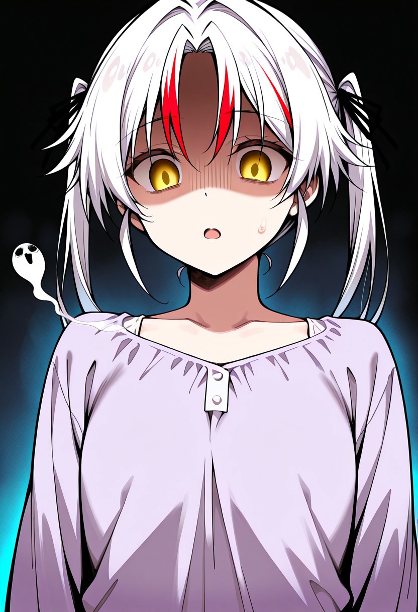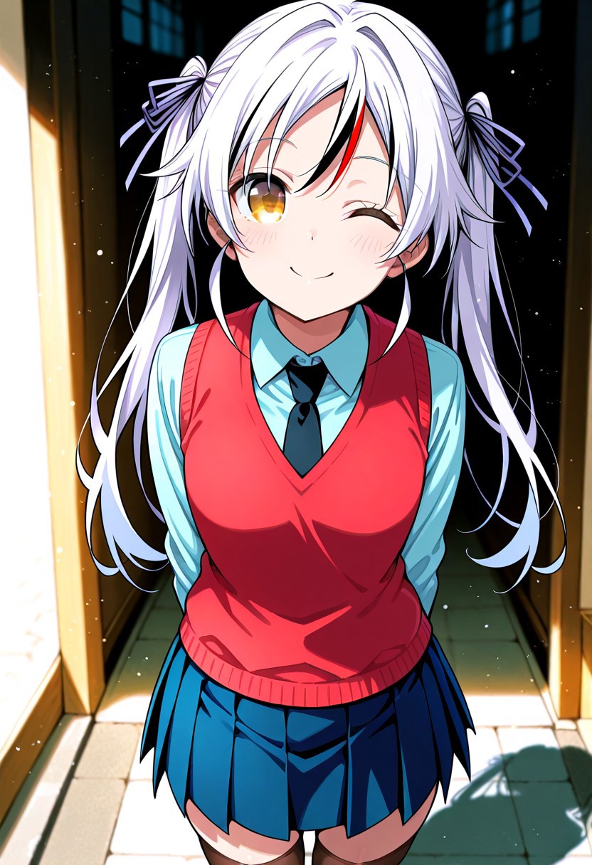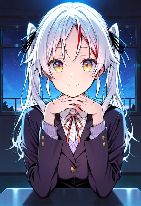 京花火乃里,1名女孩,白发,前额有红色发丝,(金色眼睛:1, 2),两条辫子,