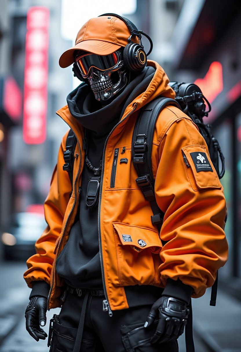 5. 사이버펑크 패션 스타일, 갑옷을 입은 캐릭터, 오렌지와 검은색 외골격 복장, 바이저가 달린 헬멧, 하이테크 백팩, 네온 도시.