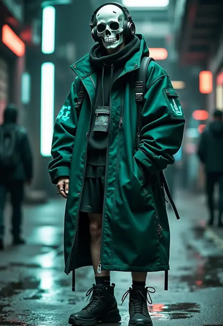 3. 사이버펑크 패션 스타일, 마스크를 쓴 인물, 어두운 녹색 오버사이즈 코트, 짧은 바지, 빛나는 파란 액센트, 산업적 분위기의 배경.
